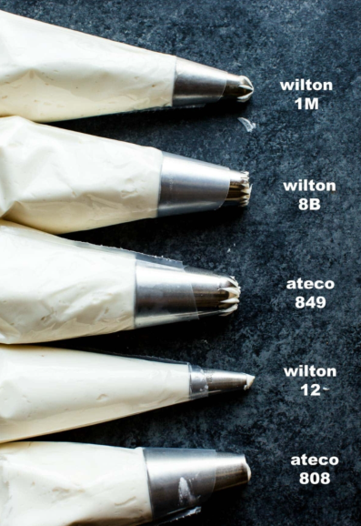 - Similar piping tips: Ateco 849 and Wilton 2D can produce the same look. In fact, any piping tip labeled “star tip” can produce a buttercream rose. Some tips are wider to create larger roses and some tips are more narrow to create smaller roses. Does that make sense?