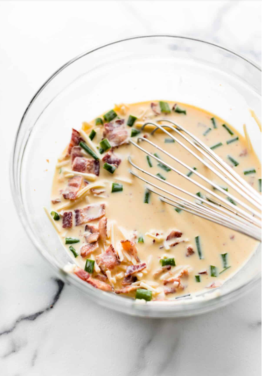 - Combine Eggs & Milk/Cream – Beat together, then whisk in the add-ins.