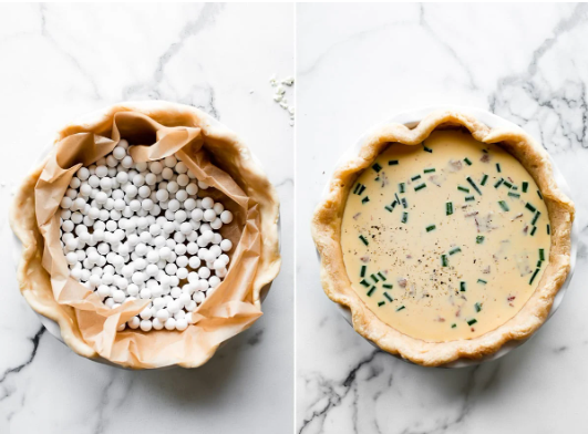 Pie recipes call for a raw pie crust, a fully baked pie crust, or a partially baked pie crust. For example, apple pie bakes the filling and crust at the same time. Coconut cream pie has a no-bake filling, so it requires a fully baked pie crust shell. Quiche, on the other hand, can bake in a raw pie crust but it will likely taste soggy. So let’s partially pre-bake it, also known as a blind bake pie crust.