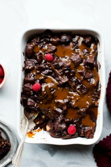 This chocolate bread pudding tastes like warm brownie squares, monkey bread, and French toast casserole all in one. It’s as fabulously rich as my flourless chocolate cake. Do I really need to continue? Pair this with rivers of salted caramel, pockets of melty chocolate chips, juicy raspberries and fresh whipped cream on top… and you basically have a mountain of chocolate covered calories. I mean a mountain of underrated delicious texture that totally deserves a chance in your kitchen too. Don’t waste another second dismissing bread pudding. This dark chocolate bread pudding is legit!