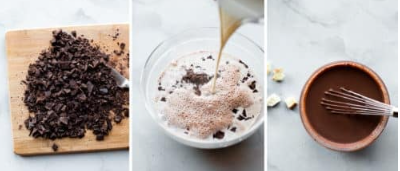 - Dark chocolate custard sauce. Use real chocolate here. You can grab semi-sweet chocolate, bittersweet chocolate, or unsweetened chocolate. You’ll need two 4-ounce bars, 8 ounces total. I used unsweetened chocolate because I knew I wanted to top the bread pudding with salted caramel and sweetened whipped cream. This bread pudding is so rich that you don’t want it over-sweetened. Heat some cream and milk (or you can use half-and-half) then pour over the chocolate and mix it all together. You’ll have a very thinned out chocolate ganache. Let it cool down for a minute (so as not to cook the eggs), then add eggs, sugar, vanilla extract, + salt. All of this makes your super chocolate-y custard.