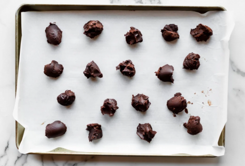 Sticky Situation: These are extra creamy truffles, which are the most delicious variety. The downside to creamy truffles is that they’re sticky to roll. You can wear rubber gloves or coat your hands in cocoa powder, but here is my #1 trick and it makes rolling SO MUCH EASIER. Scoop the truffle mixture into mounds on a lined baking sheet. (Pictured above.) Refrigerate for 20-30 minutes so the mounds “dry out.” After that, they are a little less sticky to roll. You can watch me do this in the video tutorial.