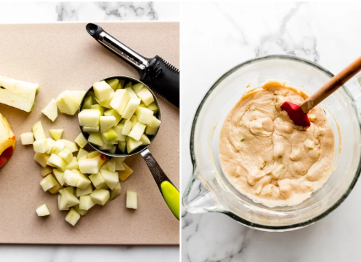 I like to make the crumb topping first so it’s ready as soon as the batter comes together. The crumb topping, while certainly optional, comes together with ingredients you use in the muffin batter—very convenient. (It’s the same crumb topping we use on peach muffins.) After that, you can peel and chop the apples into roughly 1/2-inch pieces. Pictured below is 1 cup plus several chunks on the side. You need 1 and 1/2 cups (about 180g), which is about 2 medium apples. Fold the apples into the batter.