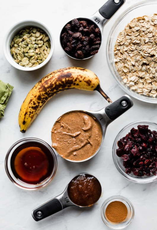 - Add-Ins: Up to you! Use about 1 and 1/2 cups total of your favorite “extras.” Some of my go to add-ins are dried cranberries, raisins, pumpkin seeds, sesame seeds, honey-roasted peanuts, pecans, sunflower seeds, dried apples, or chocolate chips. In today’s recipe, I used dried cranberries, pumpkin seeds, and regular raisins.