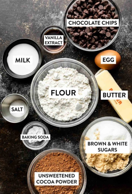 - Wet ingredients: Butter, white & brown sugars, egg, vanilla extract, and milk