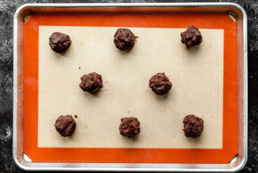 The cookie dough will undoubtedly stick to your hands during the shaping step, so have a kitchen towel or paper towel nearby. I usually wipe my hands clean after every few cookie dough balls because clean hands make rolling easier. (Same tip I recommend for peanut butter filled brownie cookies.)