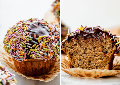 And, to turn these into a scrumptious treat, you could dip the tops of the cooled muffins into chocolate ganache and add sprinkles. (Affiliate link: I love these naturally colored sprinkles.) You can also add the streusel topping from these banana chocolate chip streusel muffins.